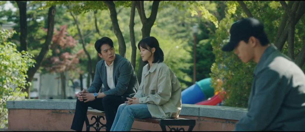 Back at the playground, Sung Jun gets up. He watches the woman’s kid play on the slide. Sung Jun suddenly has a memory of a playground and a kid in blue clothes. He sees the kid trip in his memory. Sung Jun runs at the woman’s kid (who isn’t falling) and grabs him. The woman is alarmed at this and runs toward the child. She pushes Sung Jun away. Sung Jun apologises and walks away, leaving Sung Hoon behind.