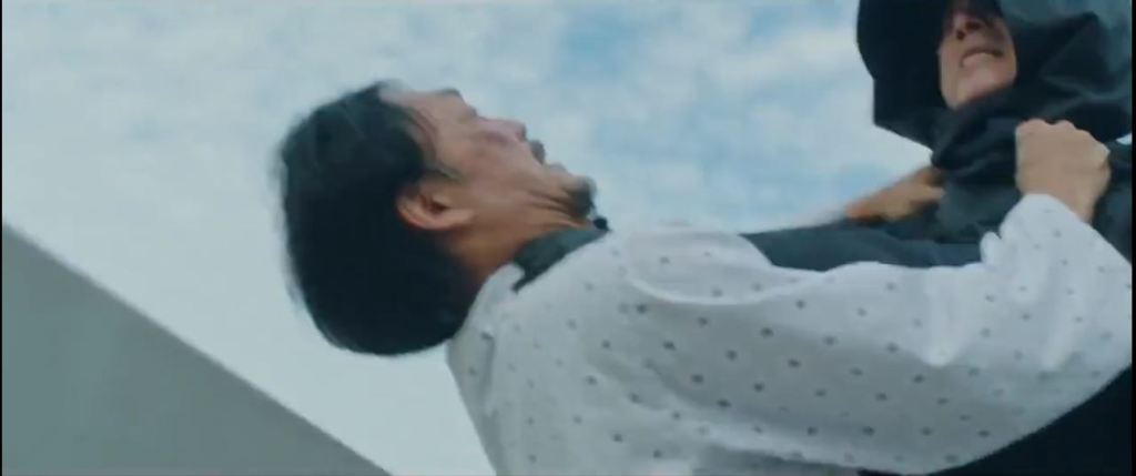 We see a montage of Baek coming into the motel wearing the same black hood and killing Jung Man Chun’s wife and child. He also beats the police officer over the head before killing Jung Man Chun. He tells Jung Man Chun that his wife and child will be waiting for him in the afterlife. He throws Jung Man Chun over the roof.