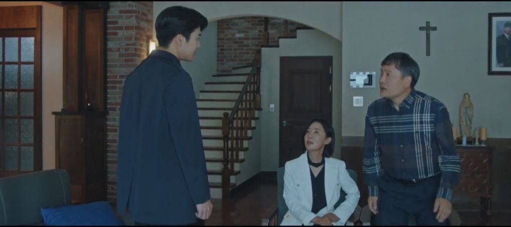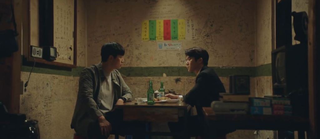 That night Eun Ki meets Sung Jun for drinks. She says Yoon Jae abducted her because she was Baek’s daughter. She says Yoon Jae probably wanted Baek to kill her or eun Ki to kill Baek. Sung Jun asks if Eun Ki is fine after hearing the truth. She says she isn’t but she knows what she should do. Sung Jun says they are investigating his mother Na. Eun Ki warns him to prepare himself as seeing the dark side of one’s family is harder than you think. He says he is preparing himself for the worst. Just then, Sung Jun notices the woman at the table beside them taking out her AirPods and shutting the case. Sung Jun recalls Yoon Jae mimicking the same motion with the cockle shell.