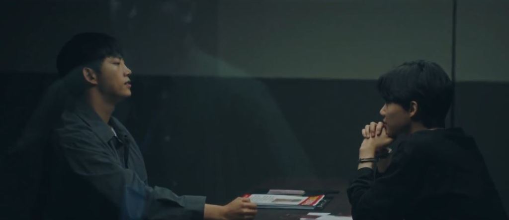 Later, Sung Jun brings Yoon Jae into the interrogation room and seats him across Sung Hoon. Yoon Jae watches Sung Hoon intently as Sung Jun walks out.
