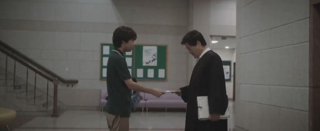 Young Sung Hoon dodges the guards outside the courtroom and hands over the petition to Judge Ryu. Young Sung Hoon’s voiceover continues to read the letter, “A little while ago my friends and I tried to escape but got caught. My friend, 24 got hit by an officer’s car and died. Number 12 almost lost his foot as it got caught in a trap and Number 7 got locked in a mental hospital and then went missing. Why did we have to risk our lives to escape? I’m writing this to tell you what kind of things happened at Hope Welfare centre.” Judge Ryu takes the petition from young Sung Hoon and walks away saying he will refer to it.