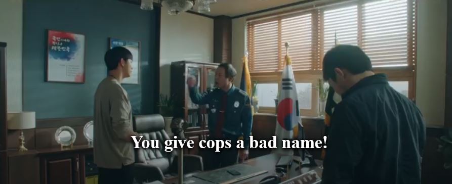 Just then, Sung Jun walks in with Oh. Sung Jun places Yeom under arrest for ordering Bae’s murder. Oh tells Yeom to come without a fight. Yeom says they are arresting an innocent man without evidence. He says they are giving cops a bad name. Sung Hoon calls him a scumbag and says he is the one giving cops a bad name.