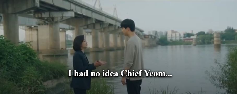 Later, Sung Jun waits by the river as Na joins him. She rushes up to him and asks what she can do. She says he is a detective and she wants his help. Sung Jun scowls as he asks if she wants him to be her accomplice. Na says she had no idea that Yeom would do such a deed. He asks how was she so calm when he said Bae was murdered.
