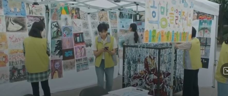 Eun Ki picks up a stash of artwork titled Hope Welfare Centre Artwork Contest. She picks out the drawings and 45’s sketches. Eun Ki puts up all the artwork and titles it ‘we believe’.